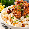 Ingrédients: macaroni (blé), poulet, lait,cheddar, sauce BBQ (sauce tomates, cassonade, vinaigre, coca-cola, café, paprika fumé, poivre, épices), beurre, huile de canola, chapelure ,farine (blé), oeuf, beurre ,jus de citron,sri racha, sel,