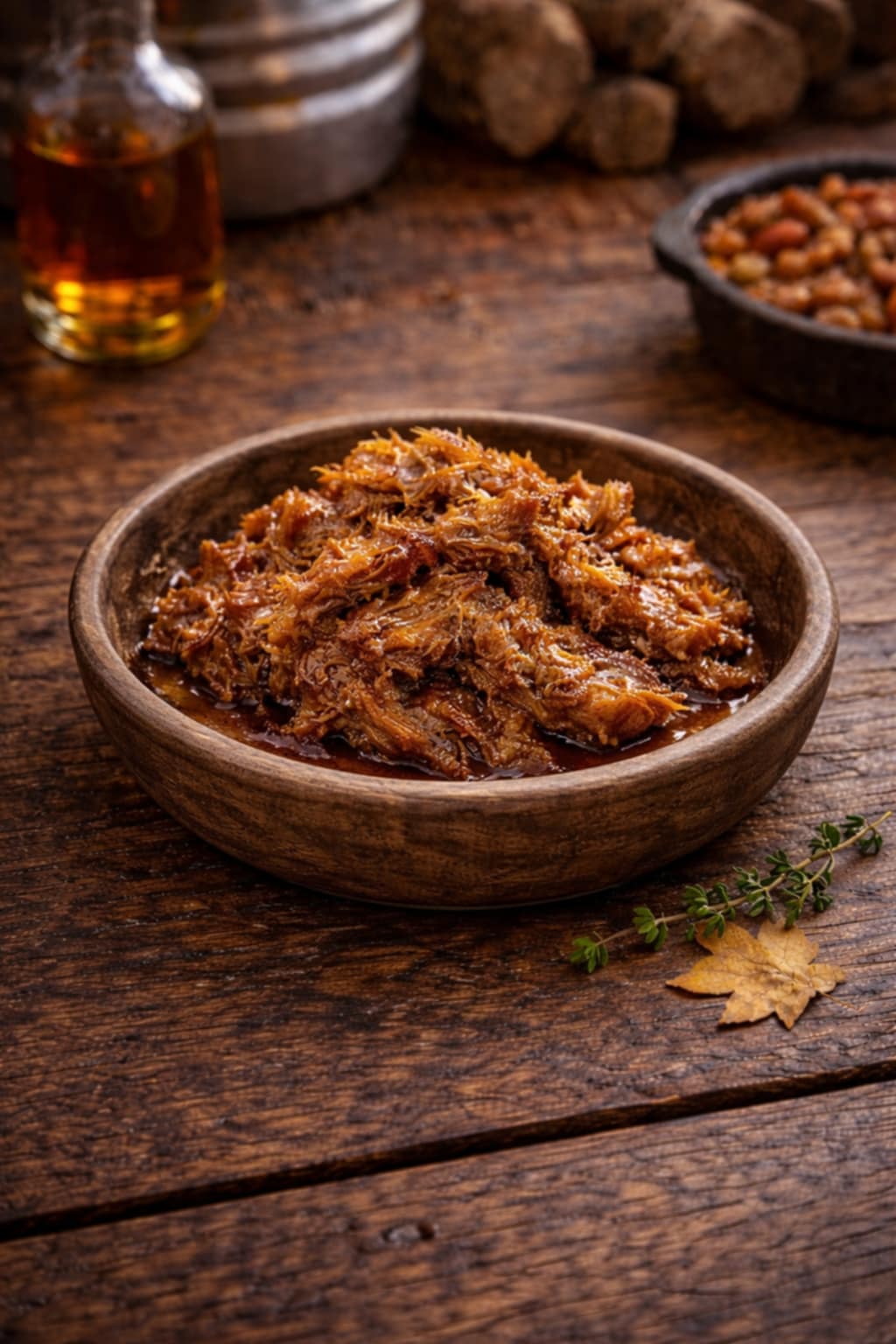Porc effiloché braisé longuement et caramélisé à l’érable.