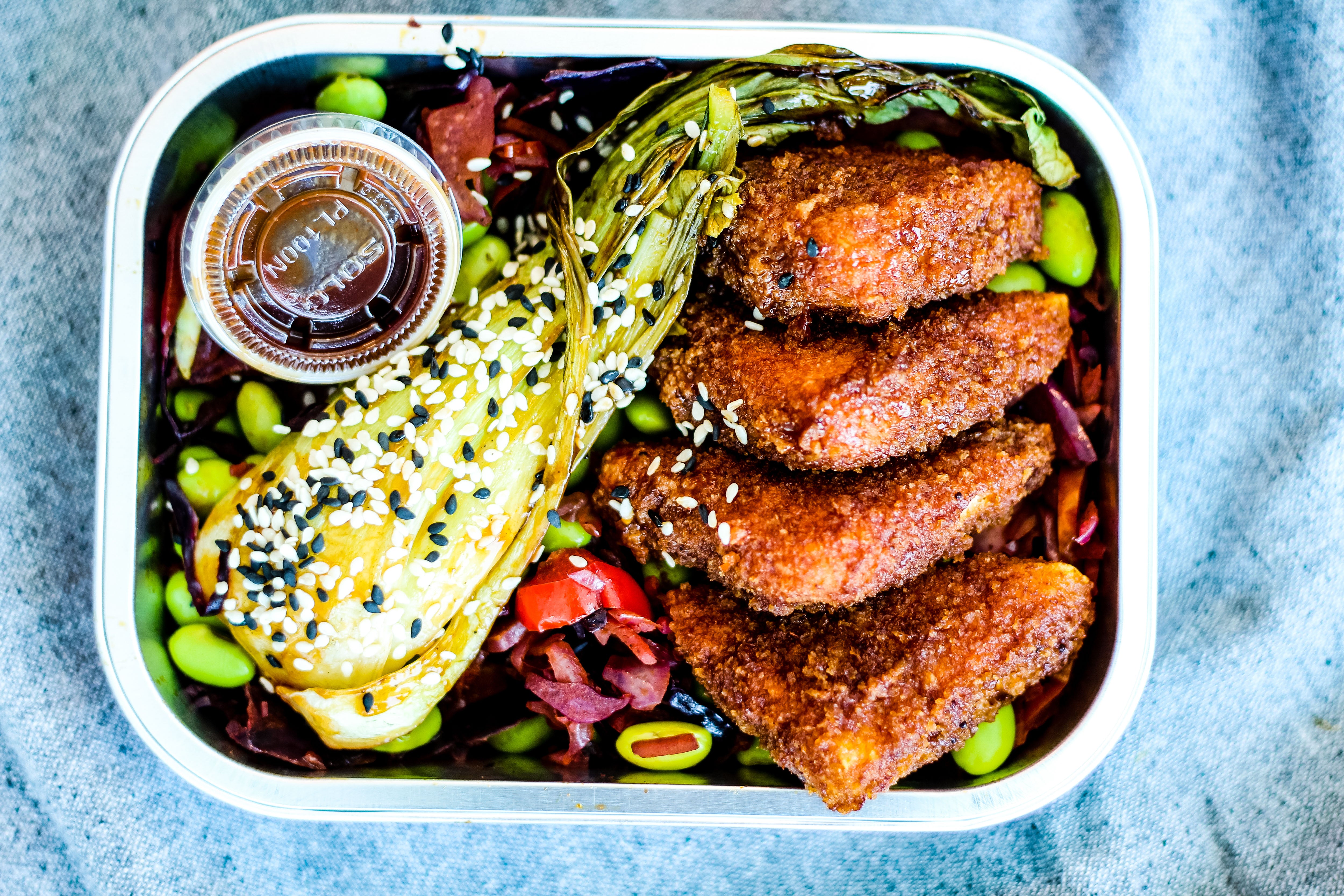 Ingrédients: tofu, haricots, chou vert/rouge, carottes, poivrons, edamame, bok choy, sauce BBQ (sauce tomates, cassonade, vinaigre, mélasse, coca-cola, épices), gingembre, vinaigre de riz, sauce oisin (sésame), citron, lait de coco, fécule de maïs, panko (gluten), oignons verts, graines de sésame, épices.